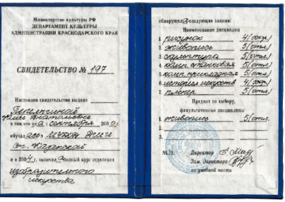 Едва успев закончить четвертый класс, мы снова в пути — на Юг, в Краснодарский край! Я не растерялась, а перезагрузилась в МБОУ ДО ДШИ МО ст. Казанская. Там мои работы буквально взлетали на конкурсах, принося мне первые и вторые места! Еще четыре года я оттачивала академическое мастерство.